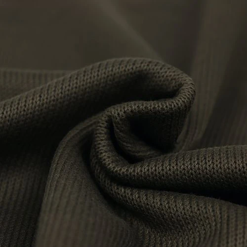 Der trüffelbraune Strickstoff hat eine Oberseite aus Strick und eine Unterseite aus Jersey für ein anschmiegsames Gefühl.
