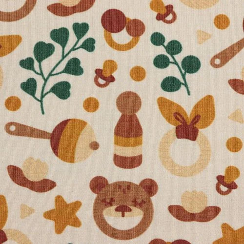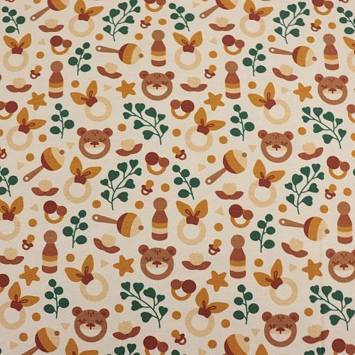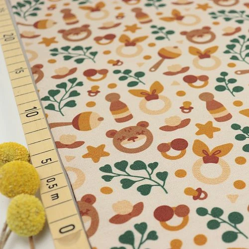 Mit seinem Motiv voller Babyspielzeuge, ist es ein richtig schöner Stoff für das erste Jahr.