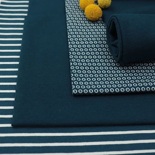 Die Kreise mit kleinen Pünktchen sind mittlerweile ein Klassiker von Stoffonkel. Man kan sie allein oder als Kombistoff farblich abgestimmt auf die Designstoffe von Stoffonkel verwenden. Die Farbe ist eine Mischung aus petrol und blau.
