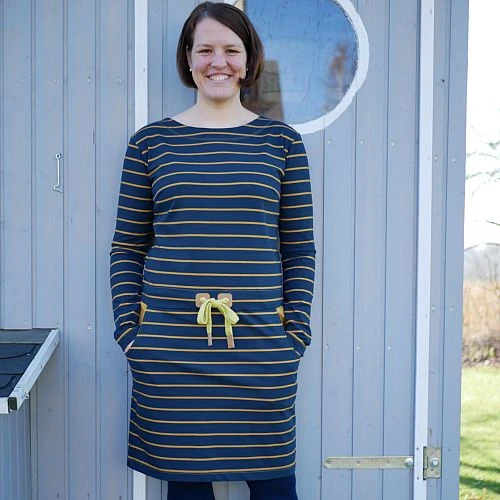 Die grauen 32mm und 4mm breiten Streifen sind nicht gedruckt, sondern es wurde farbiges Garn verstrickt. Dadurch verliert der Stoff kaum Farbe und du hast länger Freude an deinem selbstgenähten Stoffschätzchen.