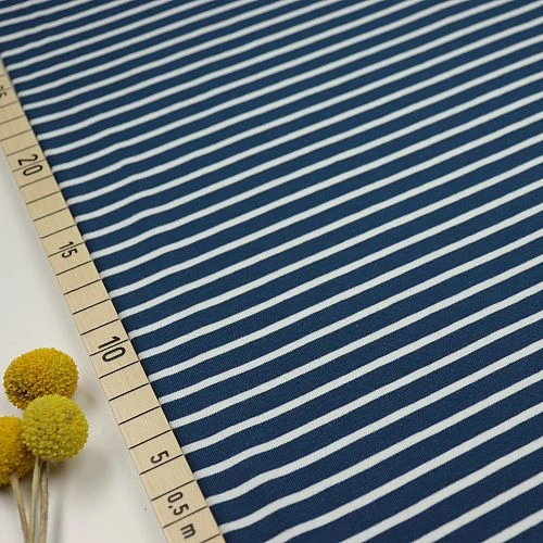 Die Streifen sind 7mm und 3mm breit und sind nicht gedruckt, sondern es wurde farbiges Garn verstrickt. Die Farbe ist eine Mischung aus Petrol und Blau.