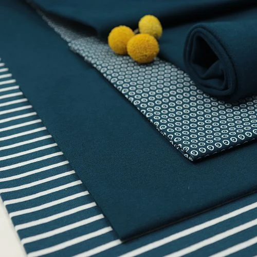 Die Farbe ist eine Mischung aus petrol und blau. Passend dazu gibt es Designstoff, Ringeljersey, Bündchen und Jersey Kuller von Stoffonkel.