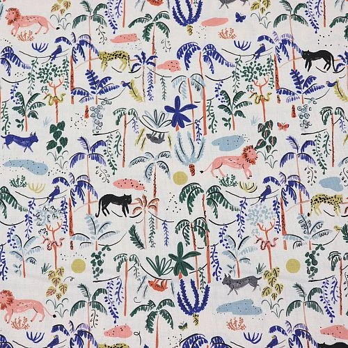 Das wunderschöne Dschungel Design mit Löwen, Leoparden und Hyänen lässt jedes Herz höher schlagen. Wenn man ganz genau hinschaut, kann man auch die eine oder andere Schlange und Faultiere entdecken. Auch für Wohnaccessoires wie Kissen und Bezüge ist der Stoff mit afrikanischen Tieren zu empfehlen.