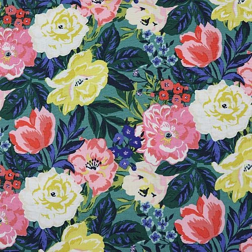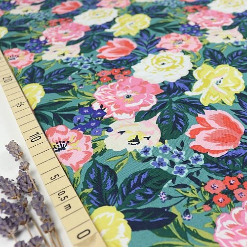 Das wunderschöne, blumige Design lässt jedes Herz höher schlagen. Ein farbenfroher Blumenstrauß auf grünem Hintergrund. Auch für Wohnaccessoires wie Kissen und Bezüge ist der Stoff zu empfehlen.