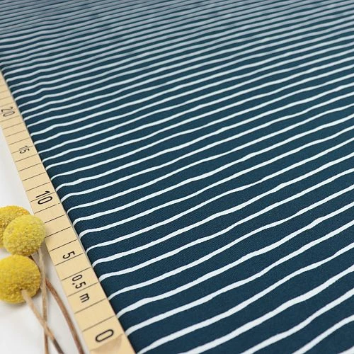 Unser gestreifter Jersey Stoff in der Farbe water by night aus dem Hause Stoffonkel schmiegt sich fabelhaft weich an deinen Körper an. Der Bio Jerseystoff mit seinen leicht wellenförmigen Streifen lässt sich wunderbar verarbeiten und ist vernäht dein komfortabler Begleiter in allen Lebenslagen. Dein neuer nachhaltiger Bio Ringeljersey eignet sich wunderbar für Baby- und Kinderbekleidung, gleichzeitig für T-Shirts, Kleider und Röcke. Freizeit- und Sportbekleidung können selbstverständlich auch daraus gezaubert werden. Außerdem sind der Kreativität zur Verarbeitung im Wohnbereich keine Grenzen gesetzt.